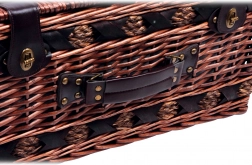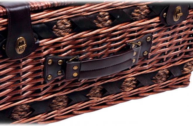 De Deluxe picknickmand is de ideale keuze voor wie niet alleen functionaliteit, maar ook esthetiek waardeert. Deze mand is volledig uitgerust voor vier personen, inclusief borden, bestek, wijnglazen, een mes, peperstrooier en zoutvaatje. Het getoonde design combineert rustieke charme met moderne functionaliteit.