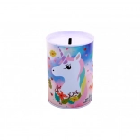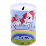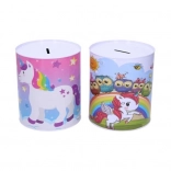 De spaarpot is versierd met vrolijke illustraties van eenhoorns die een speelse touch geven aan elke kinderkamer.