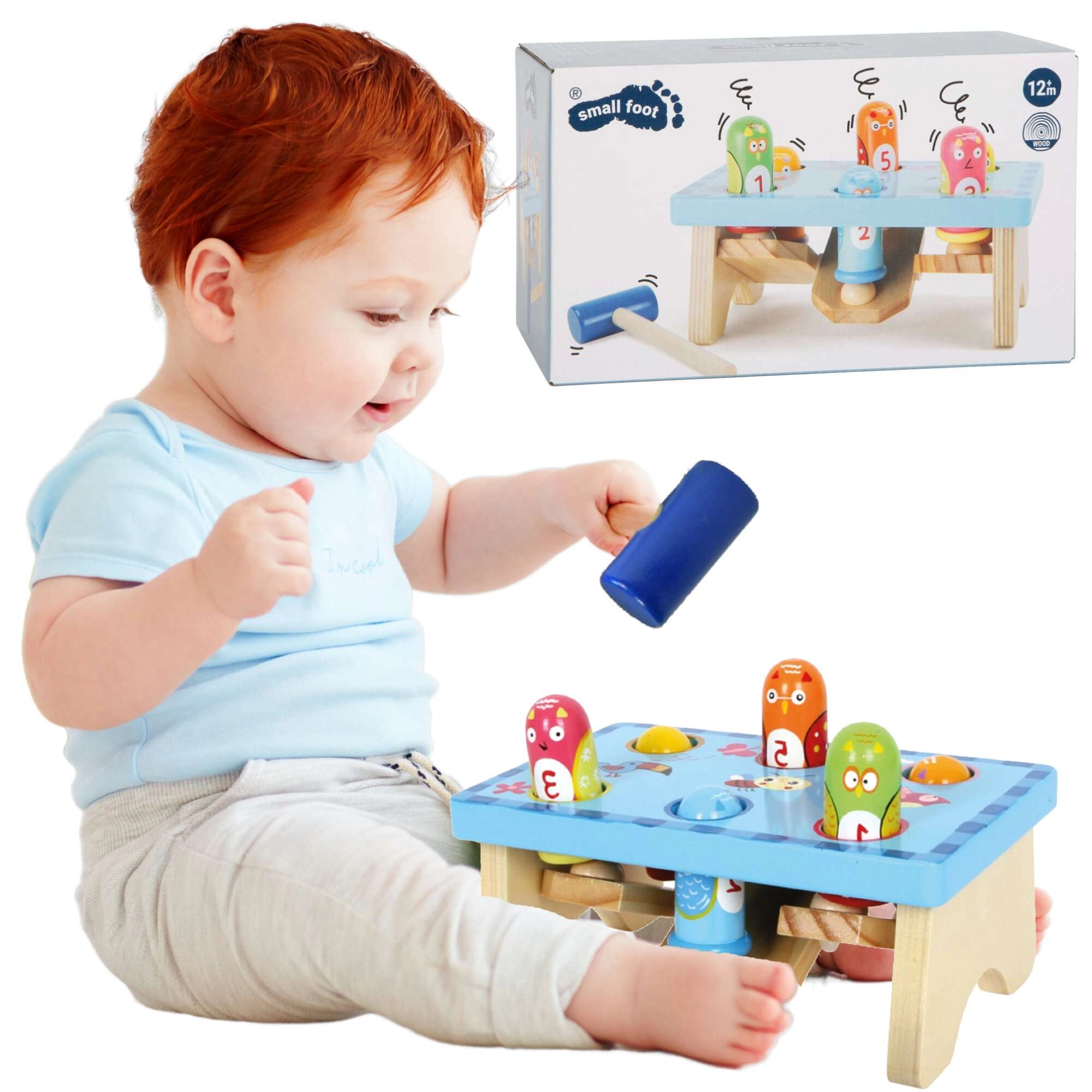 De leuke houten hamertafel van het merk Small Foot met vogeltjesmotief stimuleert de motoriek en concentratie van kinderen. De set bevat een stabiele bank in lichtblauw, gekleurde pinnen en een houten hamertje. Het speelgoed ondersteunt de oog-handcoördinatie, nauwkeurigheid van de slag en het leren van kleuren en cijfers, is gemaakt van kwalitatief hout en is geschikt voor kinderen vanaf 18 maanden.