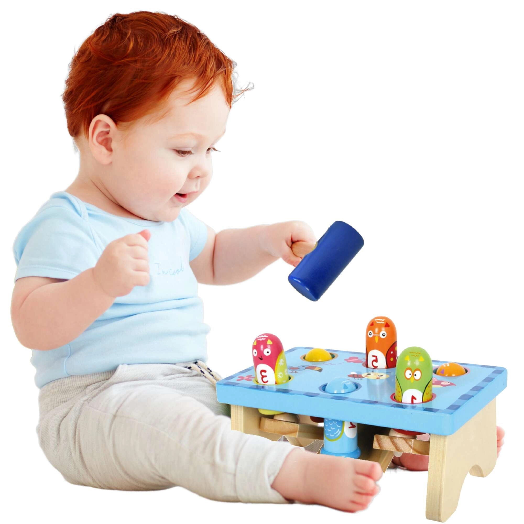 Dankzij de stevige afwerking en het ergonomische hamertje oefenen kinderen fijne motoriek, coördinatie van bewegingen en geduld. De gekleurde en genummerde pinnen helpen bij het herkennen van kleuren en tellen, waardoor spelen vanzelf samengaat met leren.