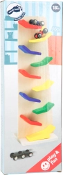 Deze hoogwaardige houten waterval-toren biedt kinderen eindeloos veel actieplezier. Leg het kleine scharnierende autootje bovenaan en kijk hoe het over de verschillende hellingen naar beneden rijdt en het kenmerkende “klap klap” creëert. Het spel stimuleert zicht, gehoor en de hand-oogcoördinatie.