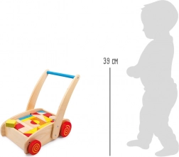 Ontdek de ideale hulp voor de eerste stapjes: een houten loopwagen met een bak vol gekleurde blokken. De robuuste constructie van massief hout en multiplex biedt stabiliteit, terwijl beukenhouten blokken in verschillende vormen (ca. 5–10 cm) uitnodigen tot creatief spel. Dankzij de comfortabele handgreep op 39 cm hoogte voelen kinderen zich zeker en veilig.