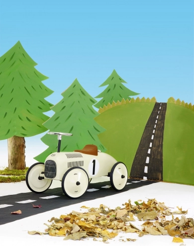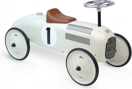Stijlvolle loopauto voor kinderen in de look van een racewagen, met retro charme en hoogwaardige metalen afwerking. Biedt stille rit dankzij rubberbanden, eenvoudige besturing met stuur en een stevige constructie met een draagvermogen van 20 kg – ideaal voor kleine racers vanaf 1,5 jaar.