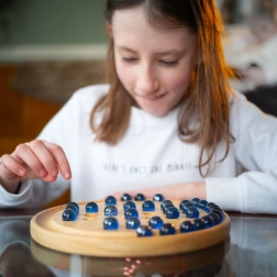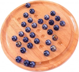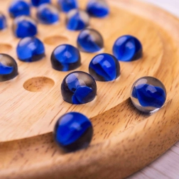 Ontdek tijdloos plezier met de houten solitaire van BIGJIGS TOYS. Glanzende blauwe knikkers en een zorgvuldig afgewerkte ronde plaat creëren een elegant logisch spel dat zowel je vindingrijkheid als geduld test. Het doel is om door te springen met de knikkers er telkens één te verwijderen, zodat er uiteindelijk één knikker overblijft.