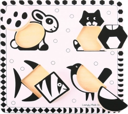 De zwart-witte inlegpuzzel van BIGJIGS TOYS is speciaal ontworpen voor baby’s en peuters, die het best reageren op hoog contrast. Vier robuuste houten vormen worden in een bord met geïllustreerde dierenmotieven gelegd, wat kinderen motiveert om opnieuw te proberen en op natuurlijke wijze de oog-handcoördinatie versterkt.