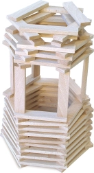 De losse plankjes maken het mogelijk vrij torens, bruggen en eigen architectuur te bouwen. Kinderen oefenen hun fantasie, geduld en fijne motoriek.