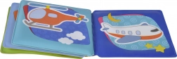 Vrolijke illustraties van auto’s, boten, een onderzeeër en een vliegtuig stimuleren de woordenschat en het visuele waarnemingsvermogen.