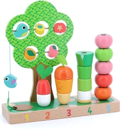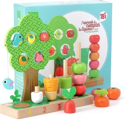 Dit hoogwaardige houten speelgoed combineert plezier en leren in één. Kinderen stapelen en rijgen wortel, prei, tomaatjes en andere vormen op genummerde pinnen 1–5, waardoor ze spelenderwijs tellen en sorteren op kleur en grootte ontwikkelen. Er is ook een boompje met schuifelementen om te ontdekken en de oog-handcoördinatie te trainen.