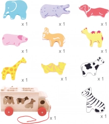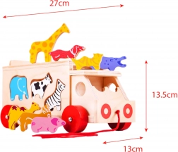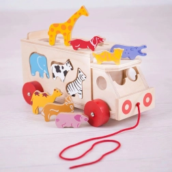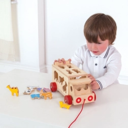 Deze hoogwaardige houten trekauto met dieren combineert een klassieke vormenstoof met bewegend spel. Kinderen kunnen de dieren door de bijpassende openingen duwen, de achterdeurtjes openen en op pad gaan door aan het koord te trekken. Het spel stimuleert op natuurlijke wijze de ontwikkeling van vaardigheid, geduld en kennismaking met kleuren en vormen.