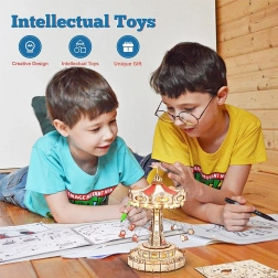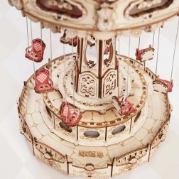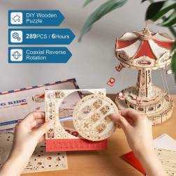 Deze 3D puzzeldoos muziekdoos toont een elegante kettingcarrousel met rijke versieringen in natuurlijke en kleuraccenten. Na montage draait de carrousel dankzij de motor, gaat het LED-licht aan en klinkt de melodie Merry Go Round, die een nostalgische, romantische sfeer oproept. De set wordt ongevouwen geleverd met een gedetailleerde handleiding – ideaal voor een creatief weekendproject.