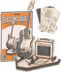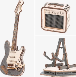 Deze houten 3D-puzzel van een elektrische gitaar zal alle liefhebbers van muziek en elegante decoraties bekoren. Het model is ontworpen om tentoongesteld te worden – zonder bewegende delen, met een pure natuurlijke look en precies uitgesneden details die in ieder interieur opvallen.