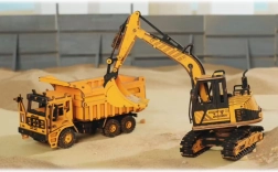 • Realistische elementen van bouwtechniek: gecombineerde arm, “hydraulica”, bak, rupsbanden en een 360° draaibare cabine.