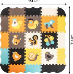 Deze grote schuimrubberen mat bestaat uit 25 onderdelen (9 hoofddelen met uitneembare dieren en 16 randstukken). Dankzij de grovere oppervlaktestructuur en contrasterende kleuren stimuleert hij op natuurlijke wijze zicht en tast. Het zachte EVA-schuim dempt vallen bij de eerste stapjes en beschermt tegen kou van de vloer.