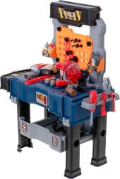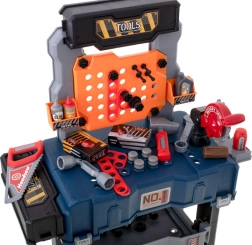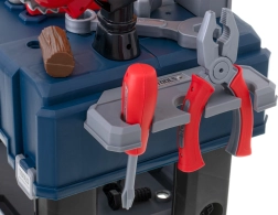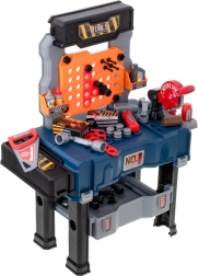 Deze draagbare koffer vouw je gemakkelijk uit tot een kinderwerkbank met veel opbergruimte – van een onderste bak voor grotere onderdelen, via een geperforeerde wand voor gereedschap, tot twee plankjes en een ruim werkblad. Kinderen leren de basis van klussen en kunnen veilig activiteiten uitproberen zoals “schroeven”, “timmeren” of “zagen”.