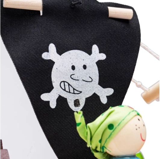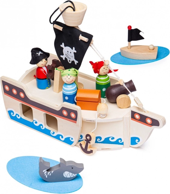 Deze houten piratenset bevat alles wat kleine piraten nodig hebben voor hun avonturen. De verpakking bevat een kapitein, twee piraten, een schip, een anker, een schatkist en een haai. Alle speelonderdelen kunnen praktisch in het schip worden geplaatst, waardoor het ideaal is voor reizen en eenvoudig mee te nemen.