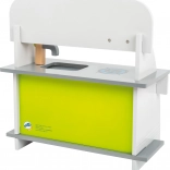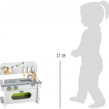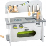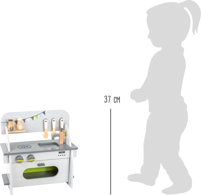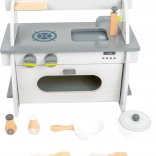 Compacte kinderkitchenette van FSC-gecertificeerd hout biedt alles voor realistisch kookspel: een oven met magnetische deurtjes, draaiknoppen met klikgeluid en uitgebreid accessoirepakket inclusief pan met deksel, zout- en pepermolen. Dankzij de slimme constructie is monteren en demonteren mogelijk zonder gereedschap.