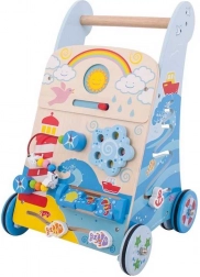 De loopwagen bevat diverse activiteiten, zoals schuifelementen en draaiblokjes, die de motoriek en coördinatie ondersteunen.