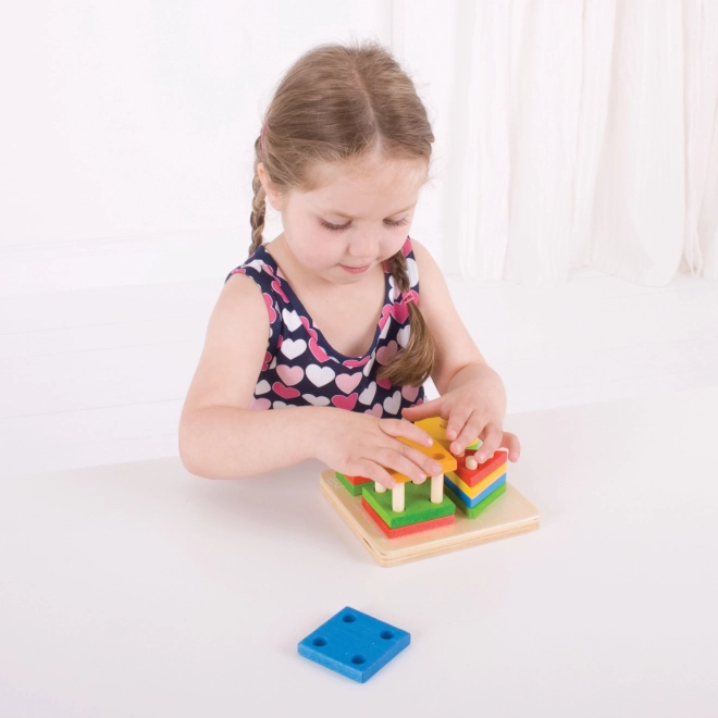 Houten basis met pinnen; kleurrijke geometrische vormen (cirkel, vierkant, driehoek, rechthoek)