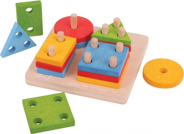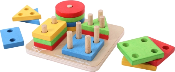 • 17 onderdelen – houten basis met pinnen en een set kleurrijke vormen