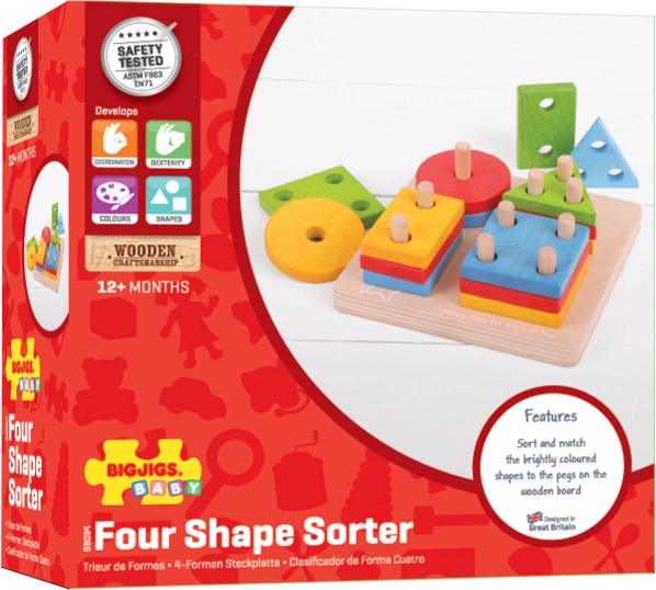 Leuke en leerzame houten sorteerset van Bigjigs Baby die fijne motoriek, herkennen van kleuren en vormen en eerste tellen stimuleert. Bevat 17 onderdelen met veilige afwerking, ideaal voor kinderen vanaf 12 maanden, gemaakt van kwalitatieve en verantwoord verkregen materialen.