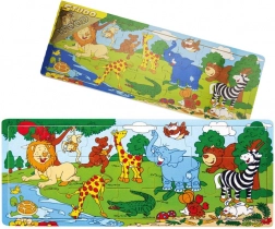 Houten bordpuzzel met een dierentuinmotief. De puzzel bestaat uit 21 stukjes.