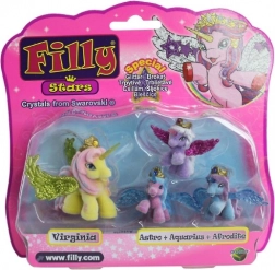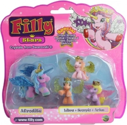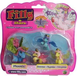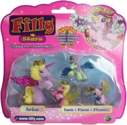 Filly Stars brengt een flinke dosis fantasie naar elke kinderkamer. De 1+3 set bevat één groter paardje en drie kleine veulentjes in vrolijke kleuren. Dankzij de glinsterende vleugels, gouden kronen en magische hoorns zullen kinderen houden van sprookjesverhalen en creatief spel.