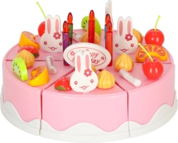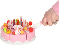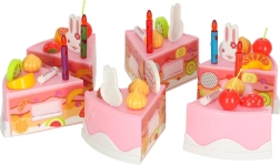 Beleef elke dag de magie van een verjaardag. De roze kindertaart met 6 stukken en het opschrift “Happy Birthday” kan dankzij klittenband eenvoudig uit elkaar worden gehaald en weer in elkaar worden gezet. Kleine koks versieren hem naar wens – met kaarsjes, konijntjes en kleurrijk fruit – en serveren hem op bordjes.