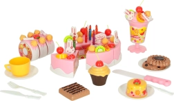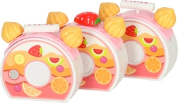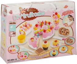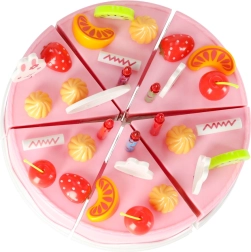 Vrolijke roze set met een snijtaart die kinderen vanaf 3 jaar zal verrassen. De taart bestaat uit 6 stukken die met klittenband aan elkaar zitten en kan met een kunststof mesje worden “gesneden”. De rijke set met fruit, versieringen en gereedschap stimuleert fantasie, rollenspel en fijne motoriek.