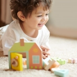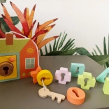• - bestaat uit een koord met sleutel, 11 blokken van verschillende vormen en een houten huisje