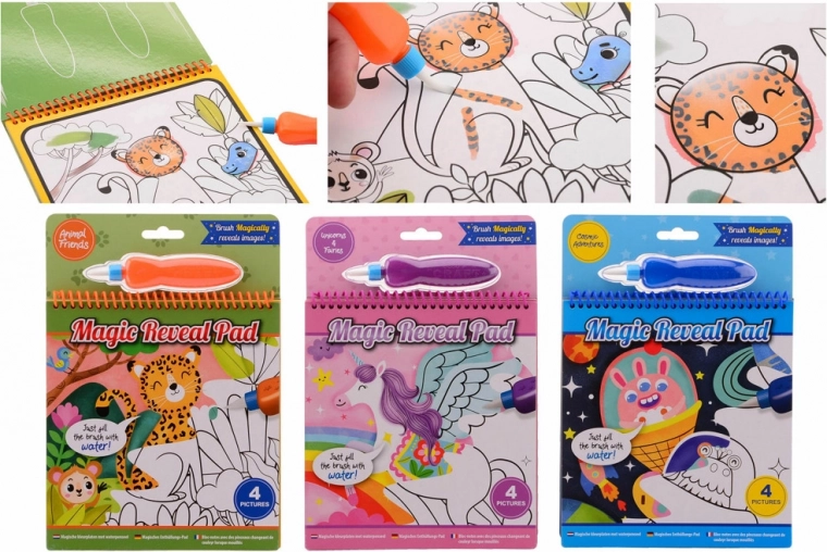 Schilderen met water – heelal, dieren en een eenhoorn. De set bevat een waterpenseel. Vul het penseel met water en je kunt gaan schilderen.