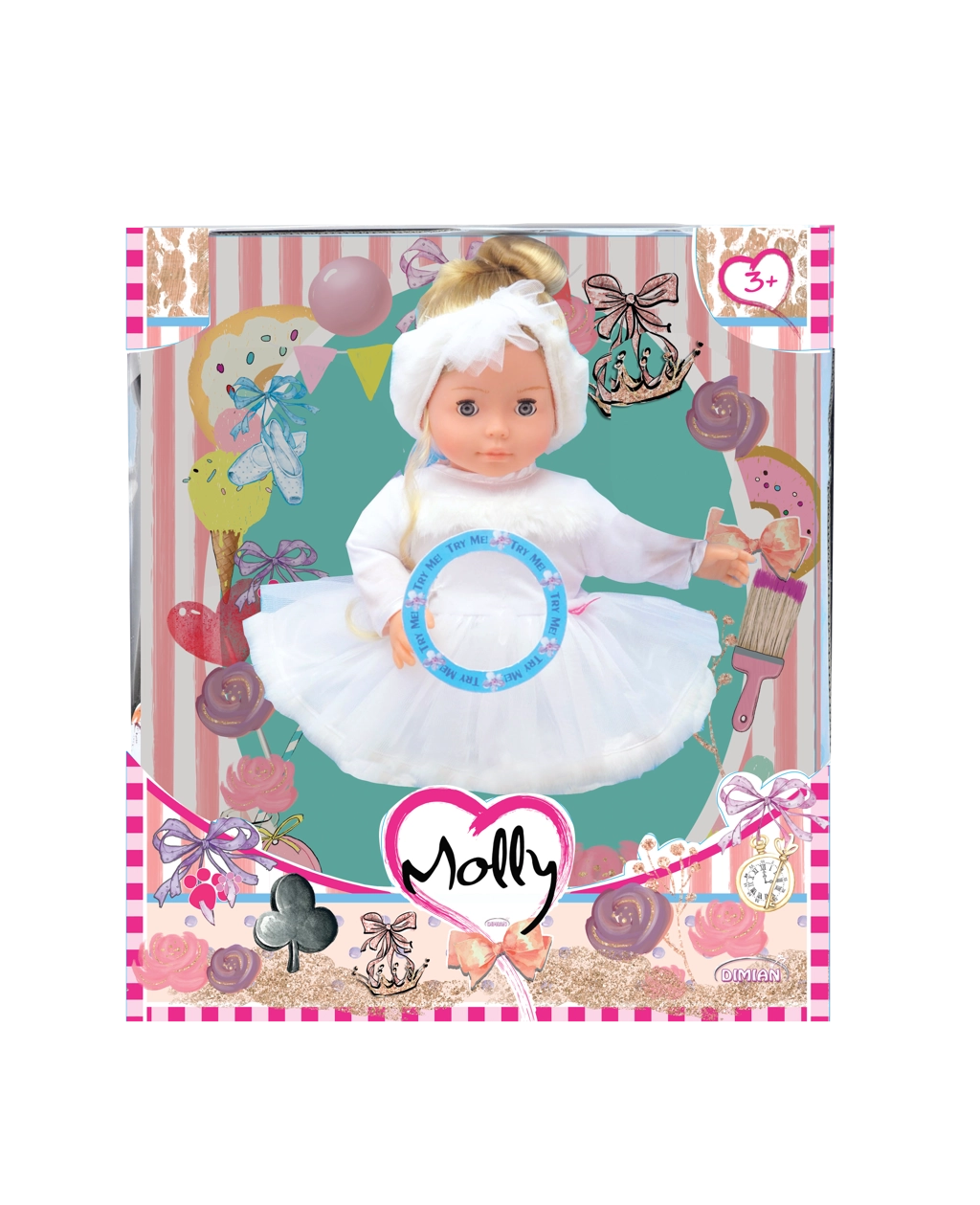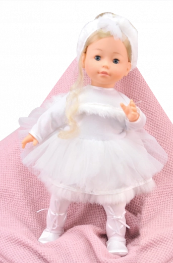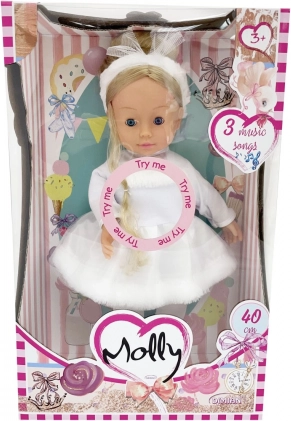 De schattige pop Bambolina Molly ballerina maakt elke kleine dansliefhebber blij. Ze heeft knipperende ogen, lang haar en draagt prachtige balletkleertjes. Ze kan 3 liedjes afspelen en dankzij de 40 cm ligt ze ook bij kleinere kinderen prettig in de hand. Geschikt vanaf 3 jaar, batterijen LR44 zijn inbegrepen.
