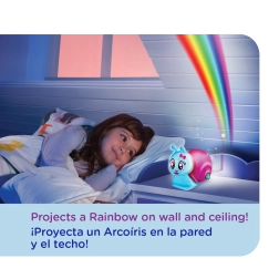 Druk op de knop op het slakkenhuis en de slak projecteert een prachtige regenboog op de muur en het plafond. Ideaal om een rustgevende nachtsfeer te creëren.