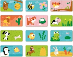 De kinderpuzzel “Wat eten dieren?” leert kleintjes om dieren correct te koppelen aan hun favoriete lekkernijen. Dankzij het eenvoudige systeem van 12 paren oefenen kinderen observatie, concentratie en oog-handcoördinatie, terwijl ze spelenderwijs nieuwe begrippen leren.