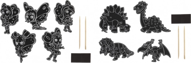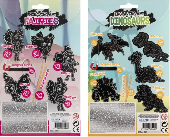 Creatieve set krasmagneten met motieven van feeën en dinosaurussen. 10 magneten + 2 kraspennetjes. Ideaal voor de koelkast en andere metalen oppervlakken.