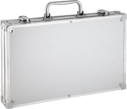 Deze metalen koffer is voorzien van een stevig handvat en veilige sluitingen, zodat je alles gemakkelijk kunt meenemen en netjes kunt organiseren.