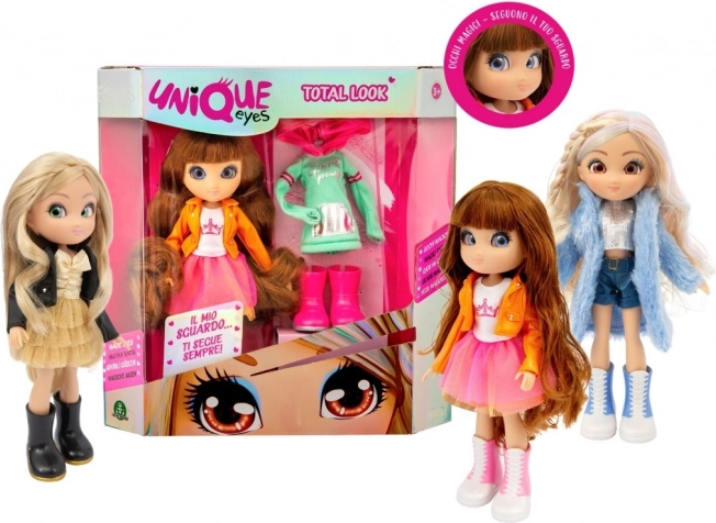 Ontdek de magie van de Unique Eyes-poppen: een stijlvolle pop van 25 cm met betoverende ogen die je altijd aankijken. Ze heeft lang haar, een modieuze outfit en schoenen en bovendien krijg je een reserve-outfit en -schoenen voor eindeloze combinaties. Geschikt voor kinderen vanaf 3 jaar.