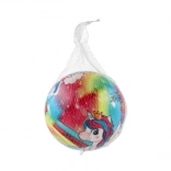 De bal is versierd met een eenhoorn thema met regenbogen, sterren en wolken, wat het visueel aantrekkelijk maakt voor kinderen.