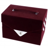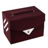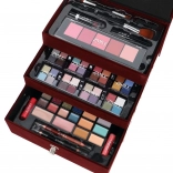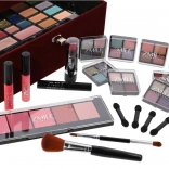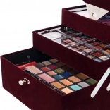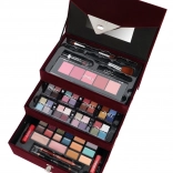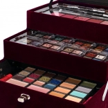 Sametachtige cosmetische koffer Beauty Case Velvety – donker bordeauxrood fluweel – in totaal 74 stuks accessoires. Bevat 32× oogschaduws in 4 compacte palettes, 5× blush, 3× wenkbrauwpoeders, 1× wenkbrauwwax, 4× crèmige oogschaduws, 4× glittercrèmes, 2× oogschaduwprimers, 8× concealer, 2× lipgloss, 1× lipstick, 1× mascara, 1× dubbelzijdig oogpotlood, 1× dubbelzijdig lippotlood, 1× blushkwast, 1× dubbelzijdige oogschaduwkwast, 4× dubbelzijdige applicator, 1× geïntegreerde spiegel. Dermatologisch getest, voldoet aan strenge EU-normen.