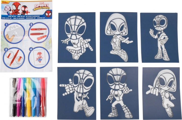 Schilderen met blaasstiften Spidy – bevat 7 blaasstiften en 6 sjablonen met afbeeldingen.