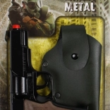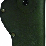 De verpakking bevat een hoogwaardige zwarte leren holster met metalen klinknagels voor versterking en een knoopsluiting voor veilige bevestiging van het wapen.