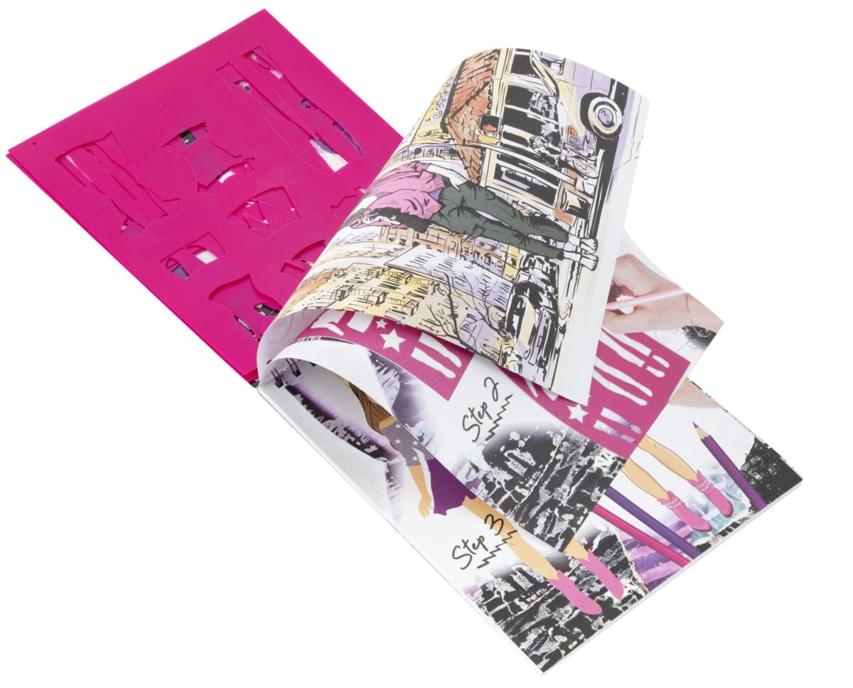 Dit stijlvolle schetsboek met stevige ringband is ideaal voor alle kleine en grotere modeliefhebbers. Dankzij de voorgedrukte silhouetten, sjablonen en stickers kun je snel originele ontwerpen maken, kleuren combineren en experimenteren met accessoires.
