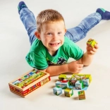 De blokken zijn opgeborgen in een praktische houten doos met afmetingen van 20 x 13 x 5,2 cm. De hele set bevat 15 stuks en is geschikt voor kinderen vanaf 12 maanden.