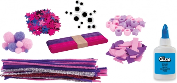 Chenilledraden, pompons, schuimvormen, kralen, zelfklevende oogjes en glitter- én gewone lijm – de ideale combinatie voor talloze knutselprojecten.