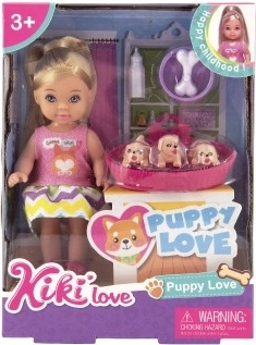- Inhoud van de verpakking: Pop Kiki, 3 puppy's, hondenbedje, voerbak, fles.