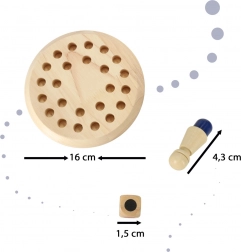 • Inhoud van de set: ronde plaat met gaten, 24 houten pinnetjes in 6 kleuren, houten dobbelsteen met kleuren