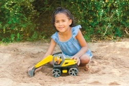 De arm met schep bedien je met een comfortabele handgreep, zodat kinderen echt zand kunnen laden en verplaatsen zoals een echte graafmachine.