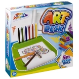 De tekentafel maakt een praktische ordening van waskrijtjes en papier mogelijk, wat het creëren voor kinderen vergemakkelijkt.