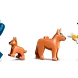 Twee politie-minifiguren, een hond en een puppy, plus een borstel, zaklamp, schep en traktaties – alles voor levendige scènes met hondengeleiders.