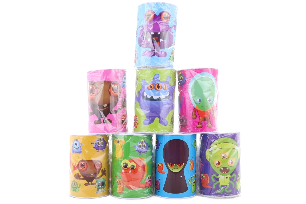 Blikken spaarpot met monstermotief, ca. 15 x 10 cm. Verpakt in een zakje. De spaarpot kan niet worden geopend. Leeftijd 3+