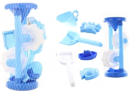 Blauwe kindermolen voor zand en water met vormpjes